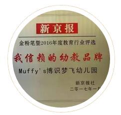 2017年1月7日,由新京报社主办的“金粉笔”暨新京报2016年度教育行业评选颁奖典礼在北京举行,现场公布了2016年度“金粉笔奖”获奖企业,Muffy’s博识梦飞幼儿园当选“我信赖的民办幼教品牌”。
